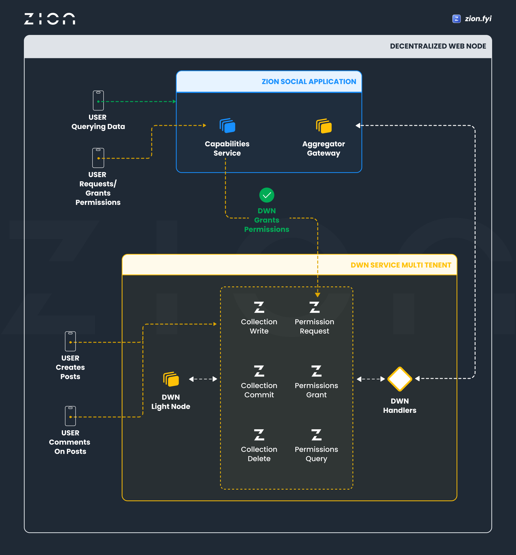 In the Zion Aggregator, DWNs feed messages that the user designates through the use of handlers. Data that meets certain conditions set by the user and aggregator is sent to the aggregator for indexing, and unlike traditional aggregators, permission for data can be revoked by DWN owners at any time thus removing the aggregator's access to that data.